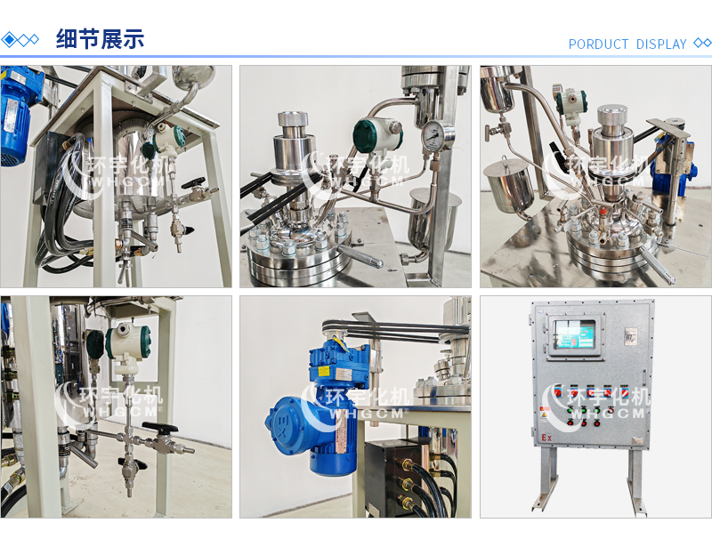 常規釜蓋開口 氣相口配針形閥,液相口配針形閥及釜內插底管,固體加料口配絲堵,測控溫口配鉑電阻,壓力表安全爆破口配壓力表及安全防爆裝置,釜內冷卻盤管進、出口配水咀