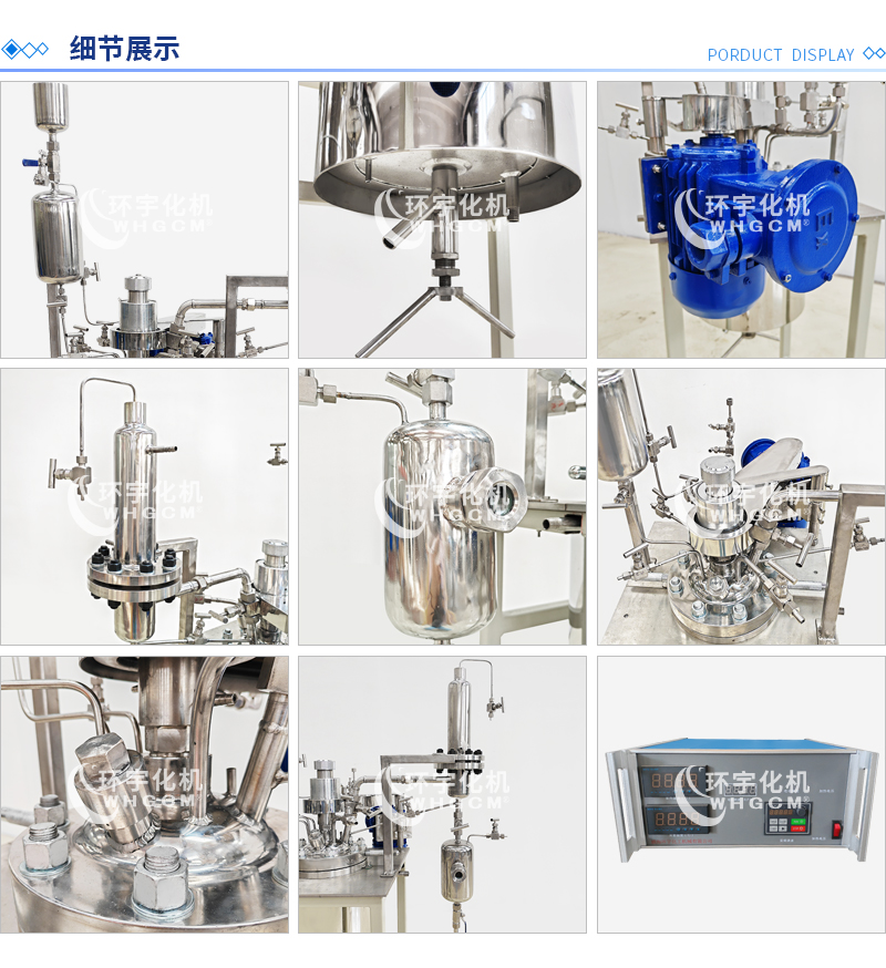 常規釜蓋開口 氣相口配針形閥,液相口配針形閥及釜內插底管,固體加料口配絲堵,測控溫口配鉑電阻,壓力表安全爆破口配壓力表及安全防爆裝置,釜內冷卻盤管進、出口配水咀