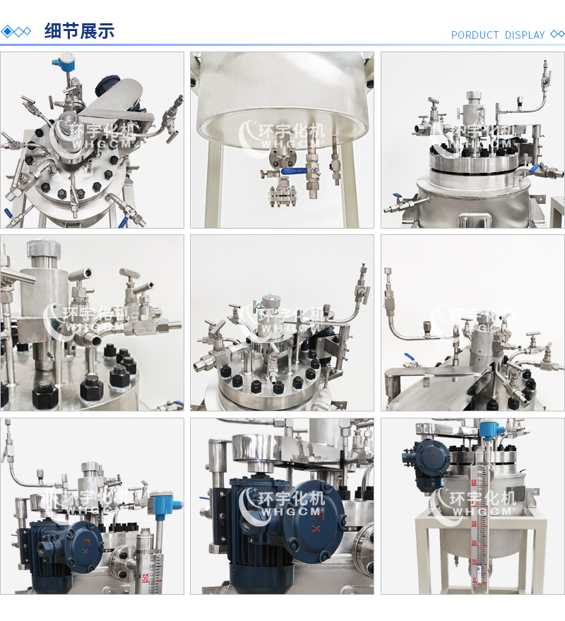 常規釜蓋開口 氣相口配針形閥,液相口配針形閥及釜內插底管,固體加料口配絲堵,測控溫口配鉑電阻,壓力表安全爆破口配壓力表及安全防爆裝置,釜內冷卻盤管進、出口配水咀