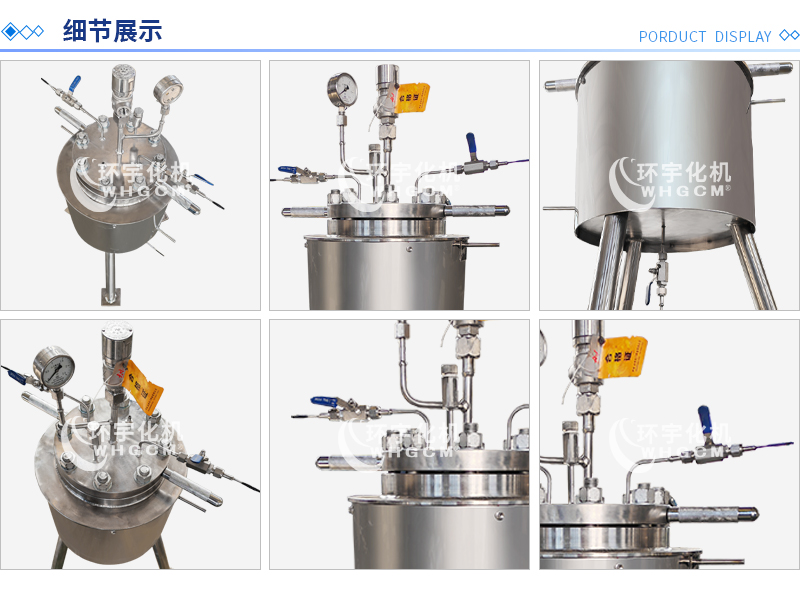 常規釜蓋開口 氣相口配針形閥,液相口配針形閥及釜內插底管,固體加料口配絲堵,測控溫口配鉑電阻,壓力表安全爆破口配壓力表及安全防爆裝置,釜內冷卻盤管進、出口配水咀