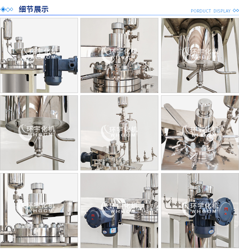 常規釜蓋開口 氣相口配針形閥,液相口配針形閥及釜內插底管,固體加料口配絲堵,測控溫口配鉑電阻,壓力表安全爆破口配壓力表及安全防爆裝置,釜內冷卻盤管進、出口配水咀