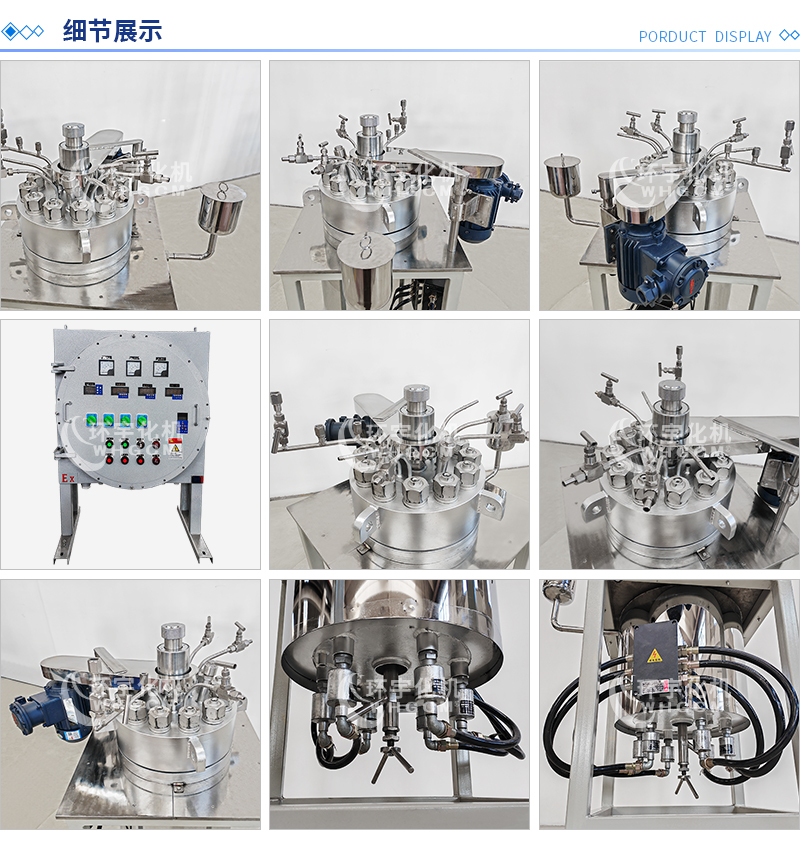 常規釜蓋開口 氣相口配針形閥,液相口配針形閥及釜內插底管,固體加料口配絲堵,測控溫口配鉑電阻,壓力表安全爆破口配壓力表及安全防爆裝置,釜內冷卻盤管進、出口配水咀