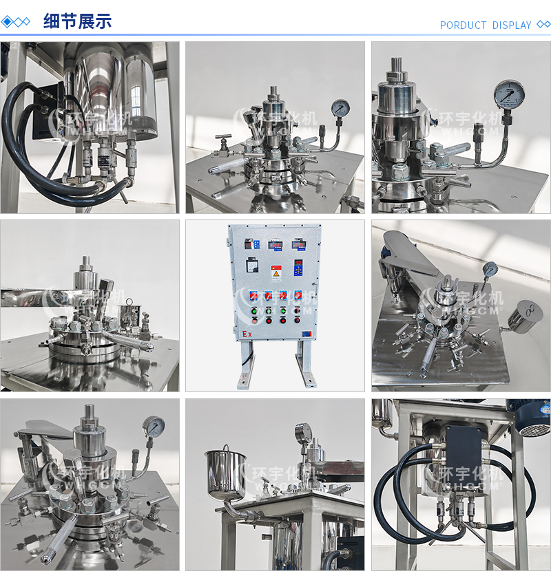 常規釜蓋開口 氣相口配針形閥,液相口配針形閥及釜內插底管,固體加料口配絲堵,測控溫口配鉑電阻,壓力表安全爆破口配壓力表及安全防爆裝置,釜內冷卻盤管進、出口配水咀