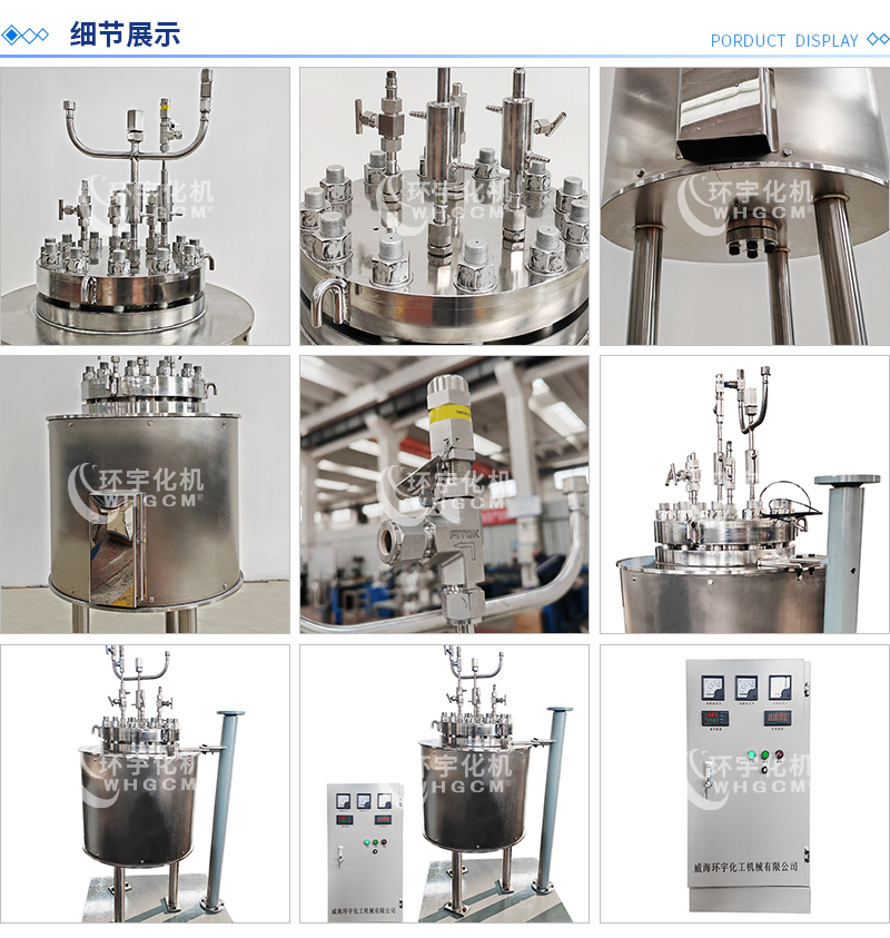 常規釜蓋開口 氣相口配針形閥,液相口配針形閥及釜內插底管,固體加料口配絲堵,測控溫口配鉑電阻,壓力表安全爆破口配壓力表及安全防爆裝置,釜內冷卻盤管進、出口配水咀