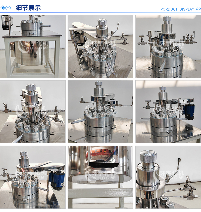 常規釜蓋開口 氣相口配針形閥,液相口配針形閥及釜內插底管,固體加料口配絲堵,測控溫口配鉑電阻,壓力表安全爆破口配壓力表及安全防爆裝置,釜內冷卻盤管進、出口配水咀