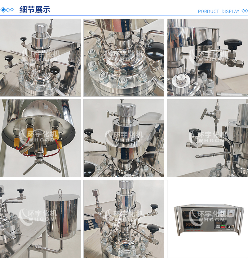 常規釜蓋開口 氣相口配針形閥,液相口配針形閥及釜內插底管,固體加料口配絲堵,測控溫口配鉑電阻,壓力表安全爆破口配壓力表及安全防爆裝置,釜內冷卻盤管進、出口配水咀