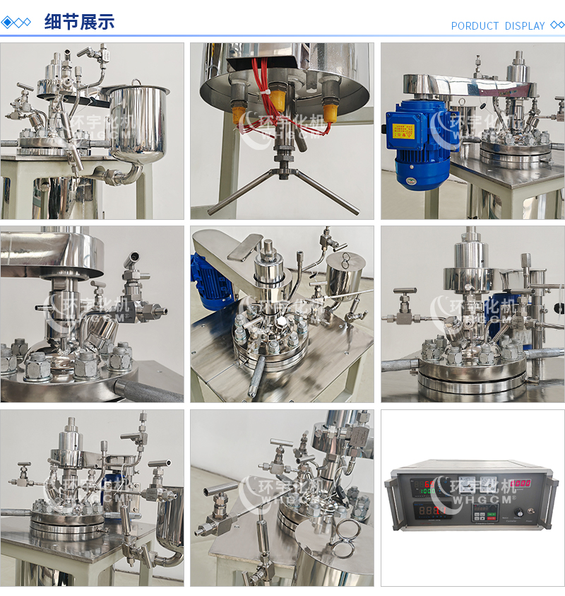 常規釜蓋開口 氣相口配針形閥,液相口配針形閥及釜內插底管,固體加料口配絲堵,測控溫口配鉑電阻,壓力表安全爆破口配壓力表及安全防爆裝置,釜內冷卻盤管進、出口配水咀