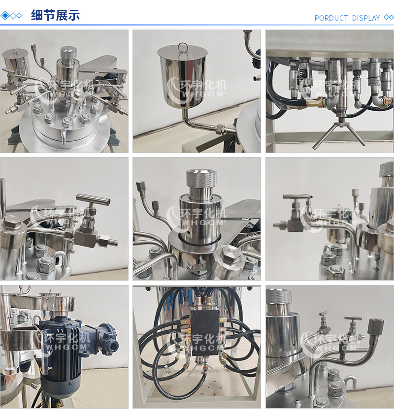 常規釜蓋開口 氣相口配針形閥,液相口配針形閥及釜內插底管,固體加料口配絲堵,測控溫口配鉑電阻,壓力表安全爆破口配壓力表及安全防爆裝置,釜內冷卻盤管進、出口配水咀