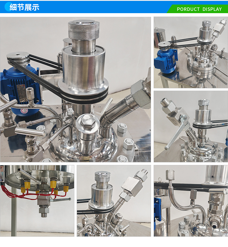 常規釜蓋開口 氣相口配針形閥,液相口配針形閥及釜內插底管,固體加料口配絲堵,測控溫口配鉑電阻,壓力表安全爆破口配壓力表及安全防爆裝置,釜內冷卻盤管進、出口配水咀